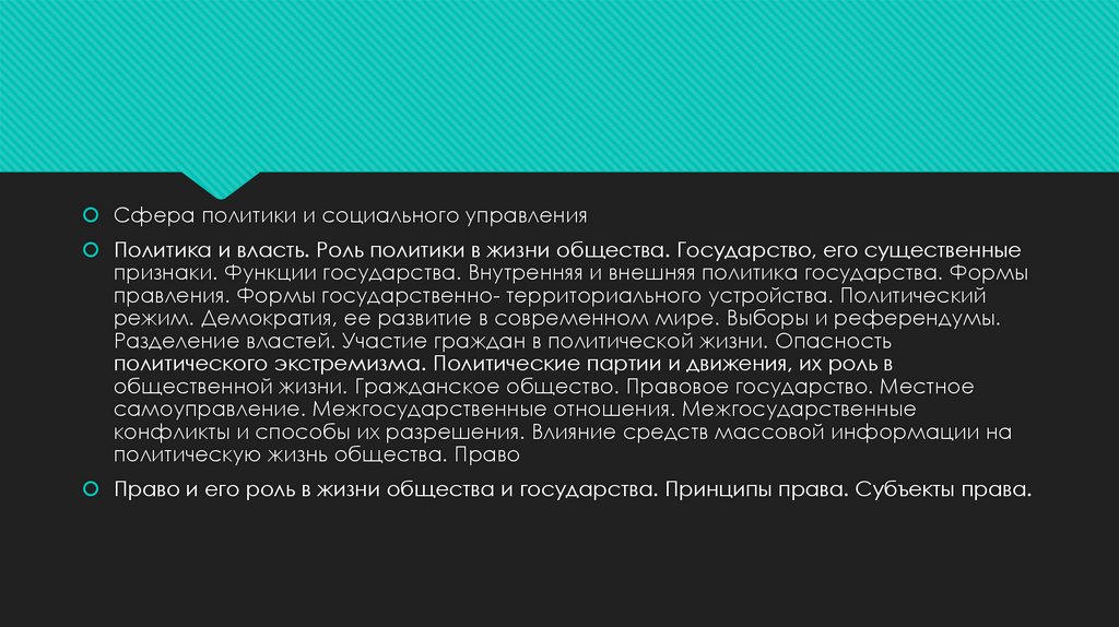 Сфера политики и социального управленияПолитика и власть. Роль политики в жизни общества. Государство, его существенные