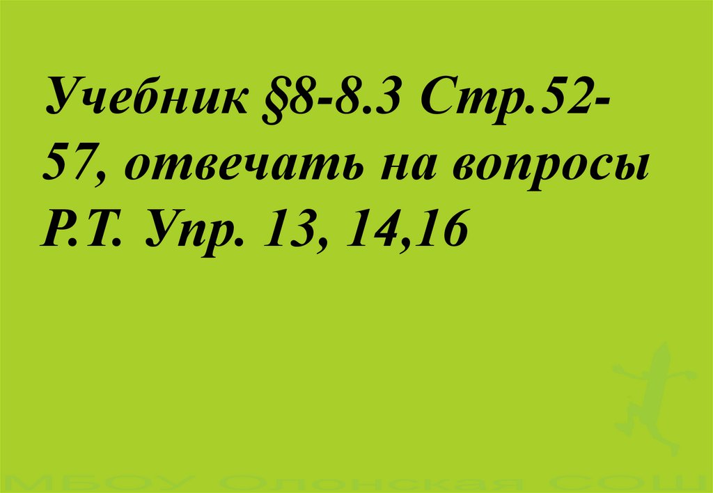 Учебник §8-8.3 Стр.5257, отвечать на вопросыР.Т. Упр. 13, 14,16