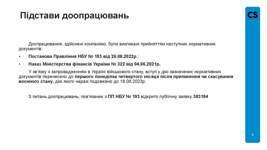 Підстави доопрацюваньДоопрацювання, здійснені компанією, були викликані прийняттям наступних нормативних
