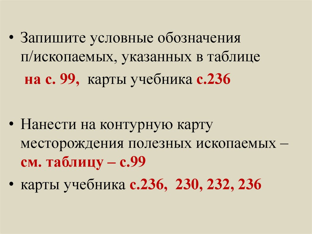 • Запишите условные обозначенияп/ископаемых, указанных в таблице