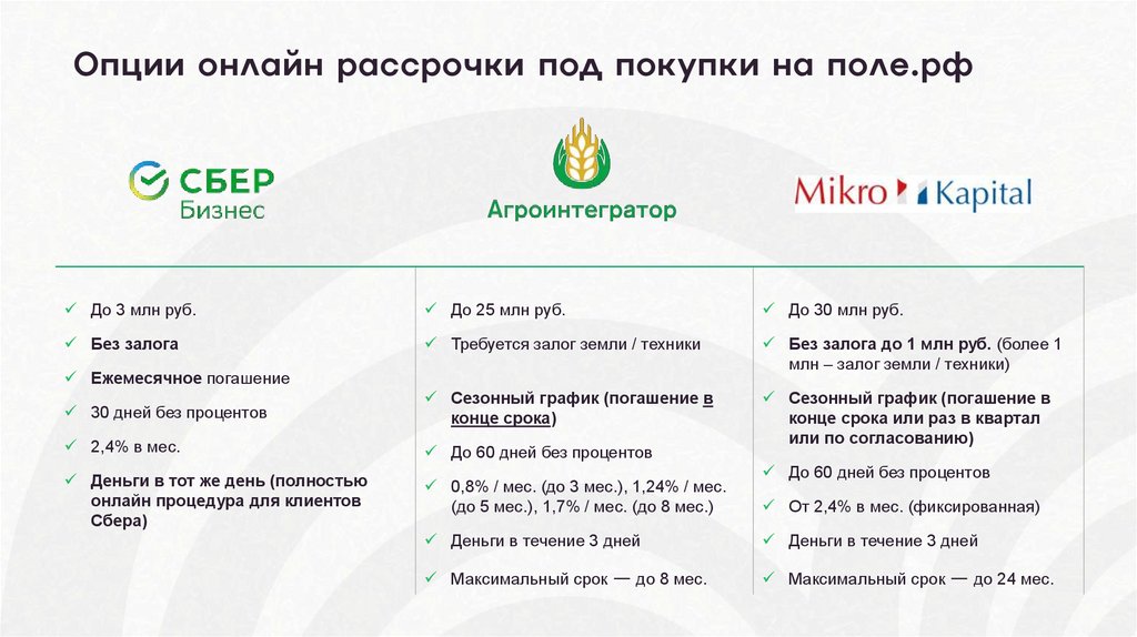 Опции онлайн рассрочки под покупки на поле.рфДо 3 млн руб.
