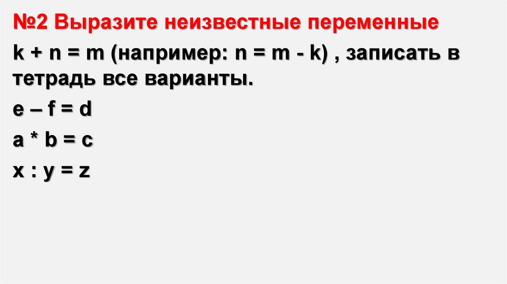 №2 Выразите неизвестные переменныеk + n = m (например: n = m - k) , записать в