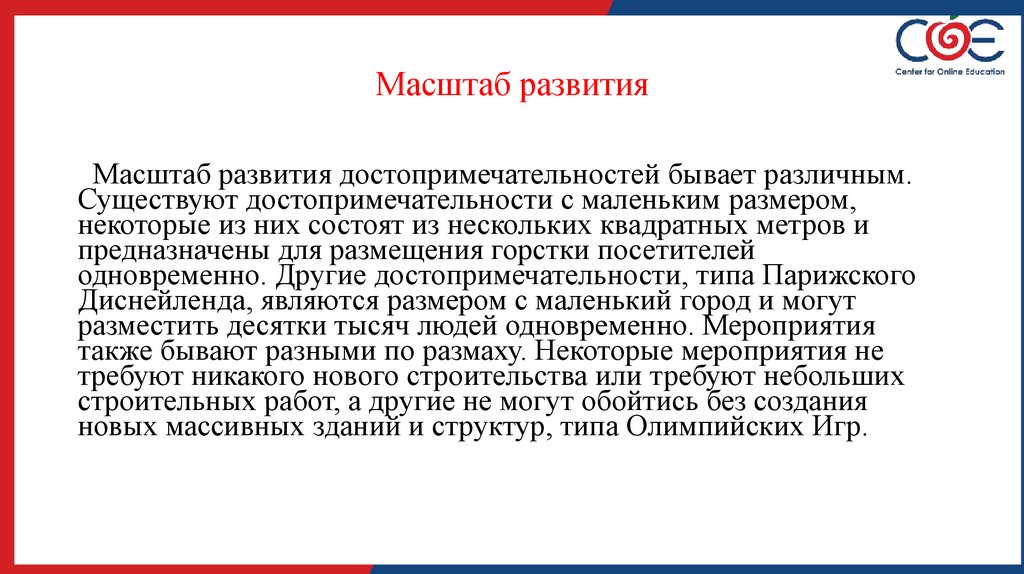 Масштаб развитияМасштаб развития достопримечательностей бывает различным.