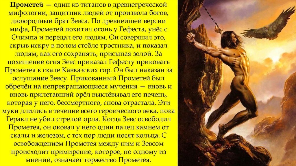 Прометей — один из титанов в древнегреческоймифологии, защитник людей от произвола богов,