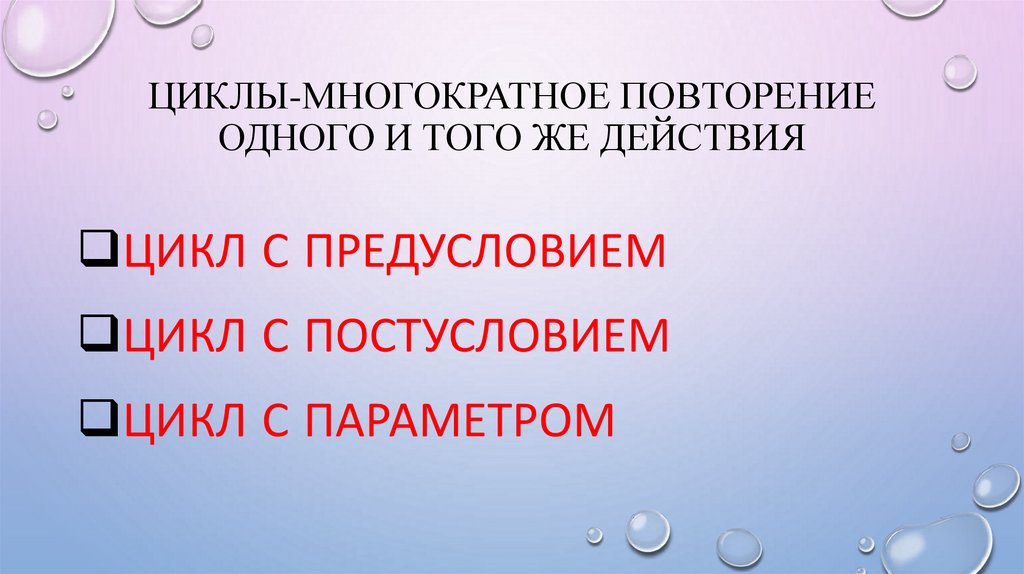 ЦИКЛЫ-МНОГОКРАТНОЕ ПОВТОРЕНИЕОДНОГО И ТОГО ЖЕ ДЕЙСТВИЯ