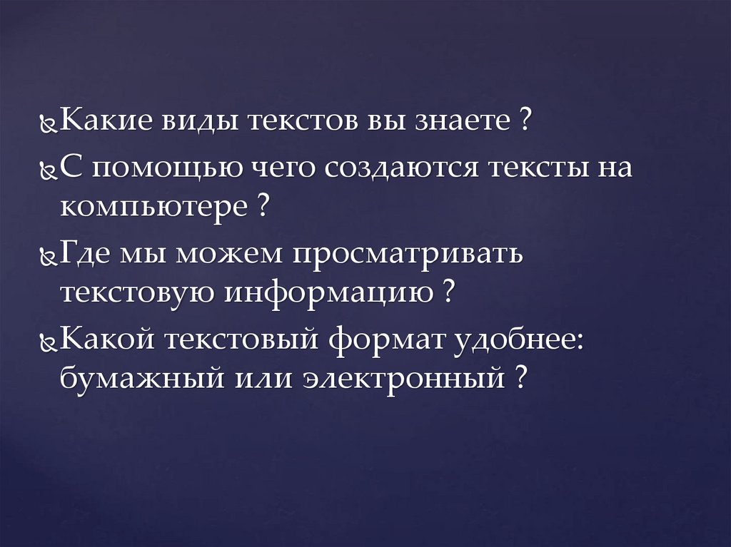 Какие виды текстов вы знаете ?С помощью чего создаются тексты на