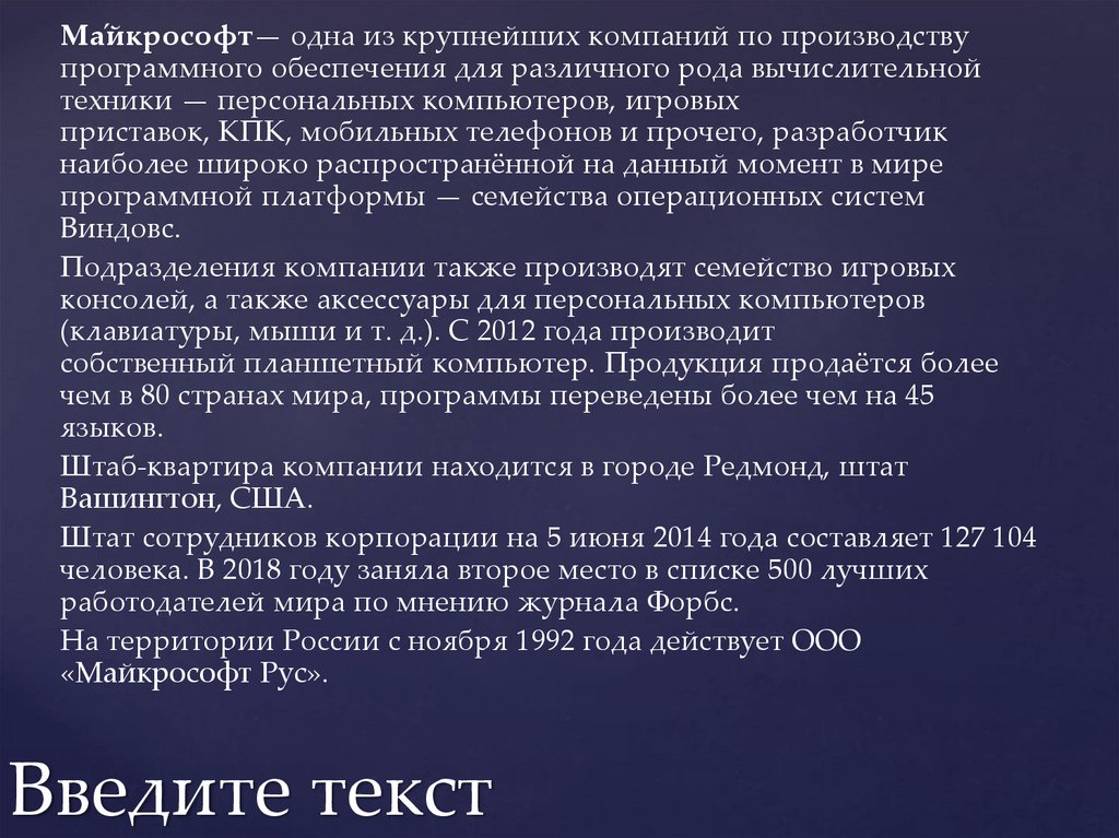 Ма́йкрософт— одна из крупнейших компаний по производствупрограммного обеспечения для различного рода вычислительной