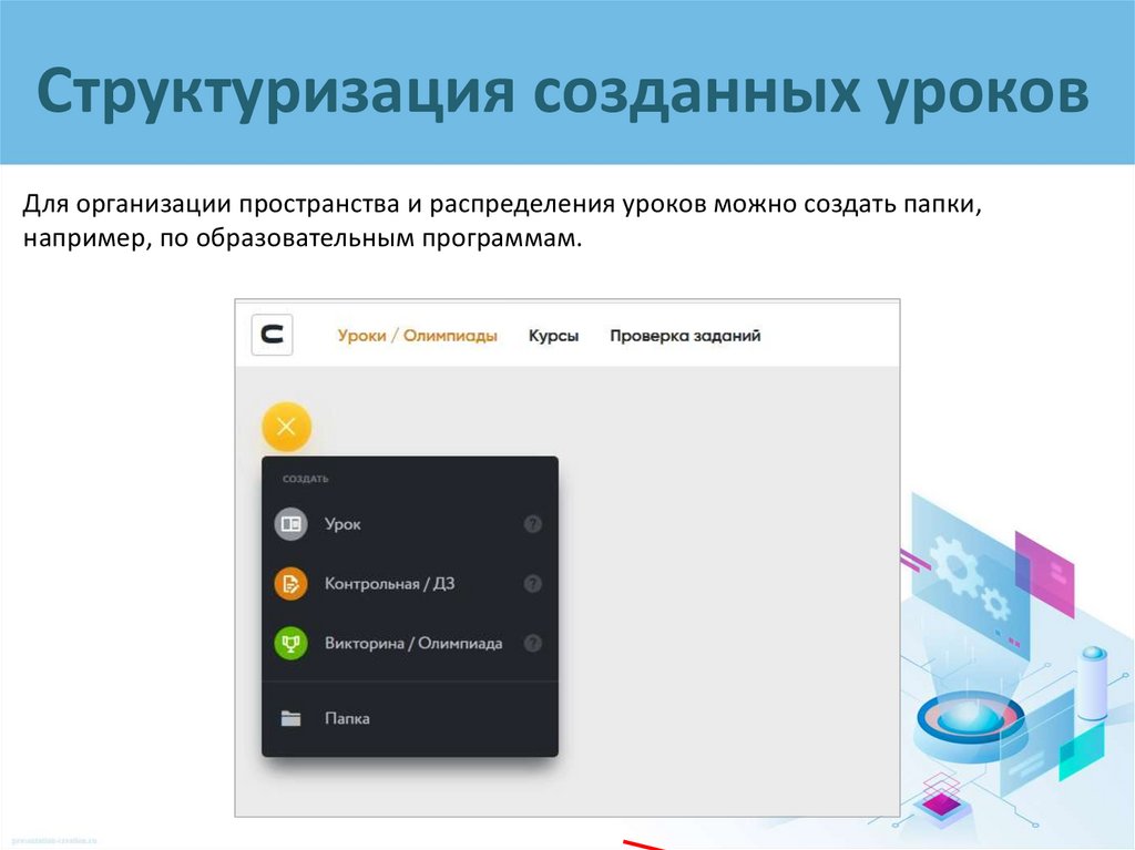 Структуризация созданных уроковДля организации пространства и распределения уроков можно создать папки,