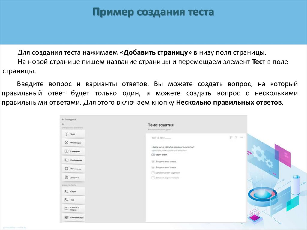 Пример создания тестаДля создания теста нажимаем «Добавить страницу» в низу поля страницы.