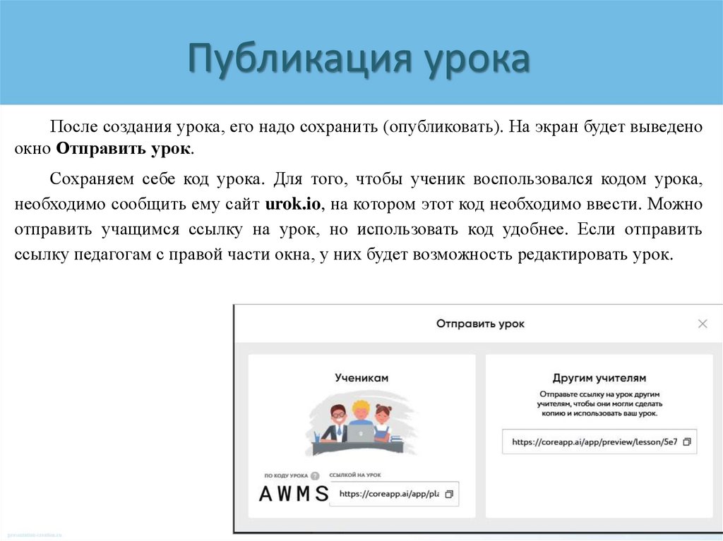 Публикация урокаПосле создания урока, его надо сохранить (опубликовать). На экран будет выведено