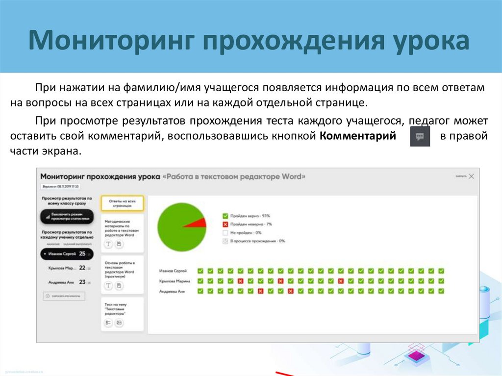 Мониторинг прохождения урокаПри нажатии на фамилию/имя учащегося появляется информация по всем ответам
