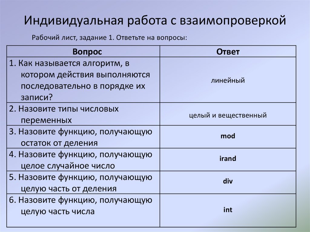 Индивидуальная работа с взаимопроверкойРабочий лист, задание 1. Ответьте на вопросы: