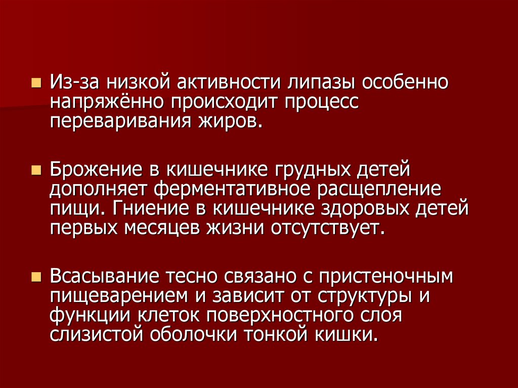 Из-за низкой активности липазы особеннонапряжённо происходит процесс