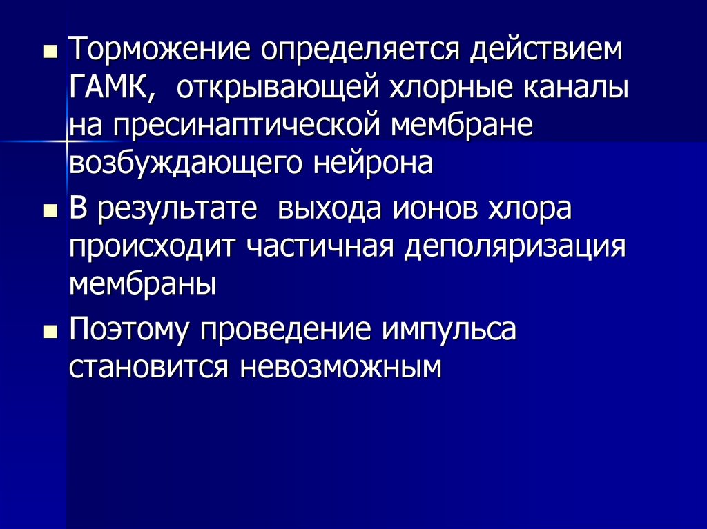 Торможение определяется действиемГАМК, открывающей хлорные каналы