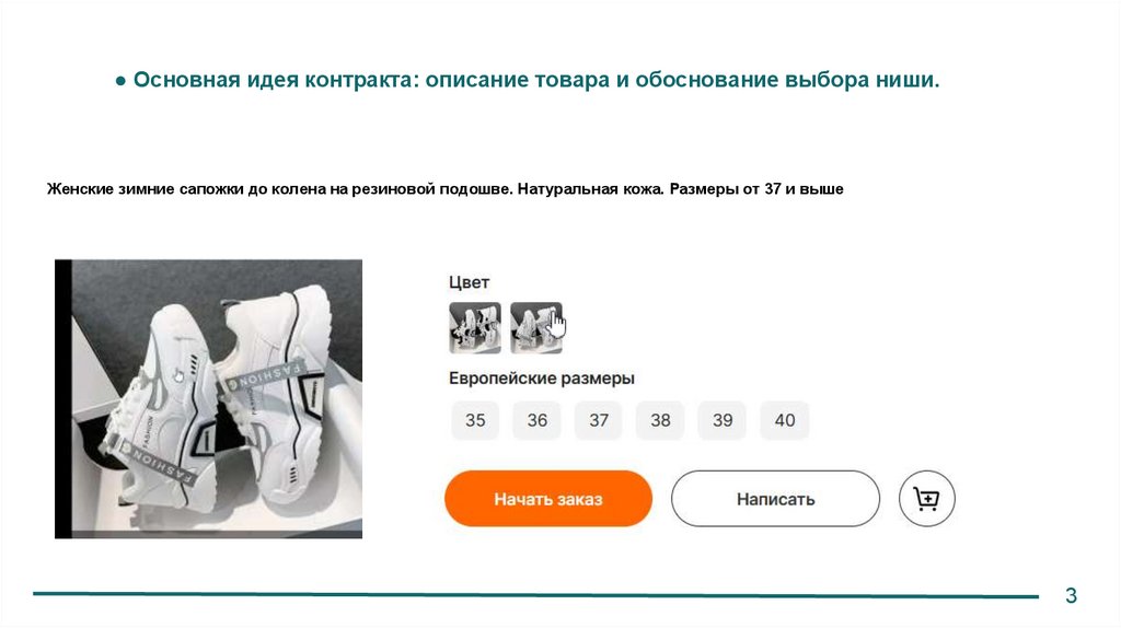 ● Основная идея контракта: описание товара и обоснование выбора ниши.Женские зимние сапожки до колена на резиновой подошве. Натуральная кожа. Размеры от 37 и выше
