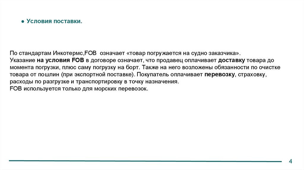 ● Условия поставки.По стандартам Инкотермс,FOB означает «товар погружается на судно заказчика».