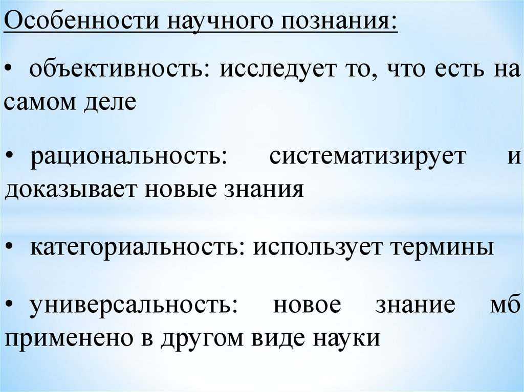 Особенности научного познания:• объективность: исследует то, что есть на