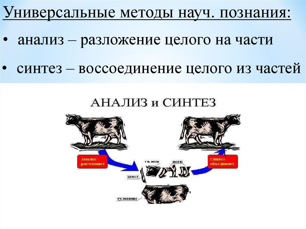 Универсальные методы науч. познания:• анализ – разложение целого на части