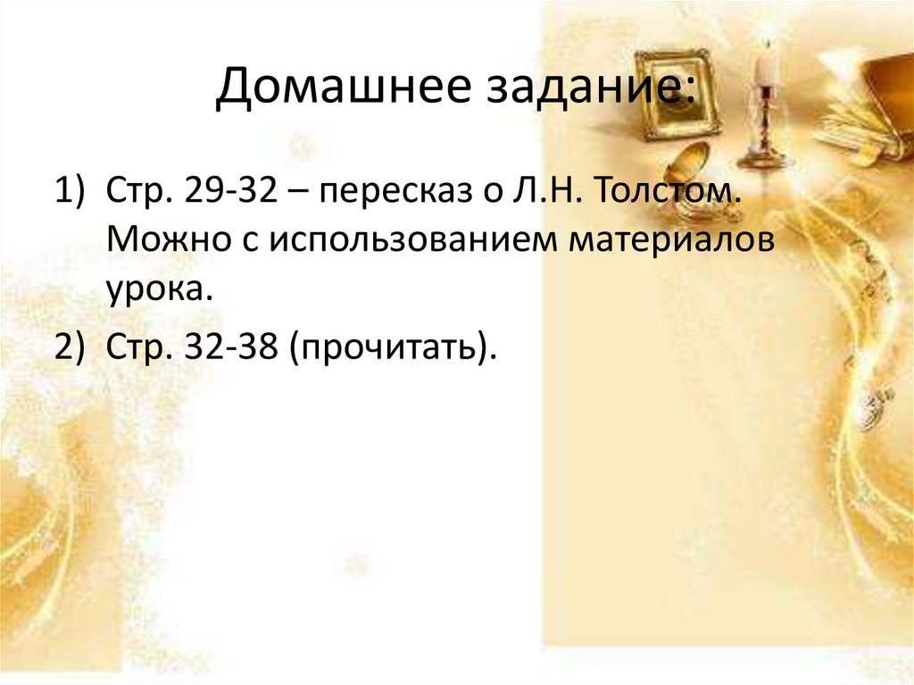 Домашнее задание:1) Стр. 29-32 – пересказ о Л.Н. Толстом.