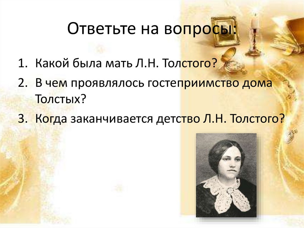 Ответьте на вопросы:1. Какой была мать Л.Н. Толстого?