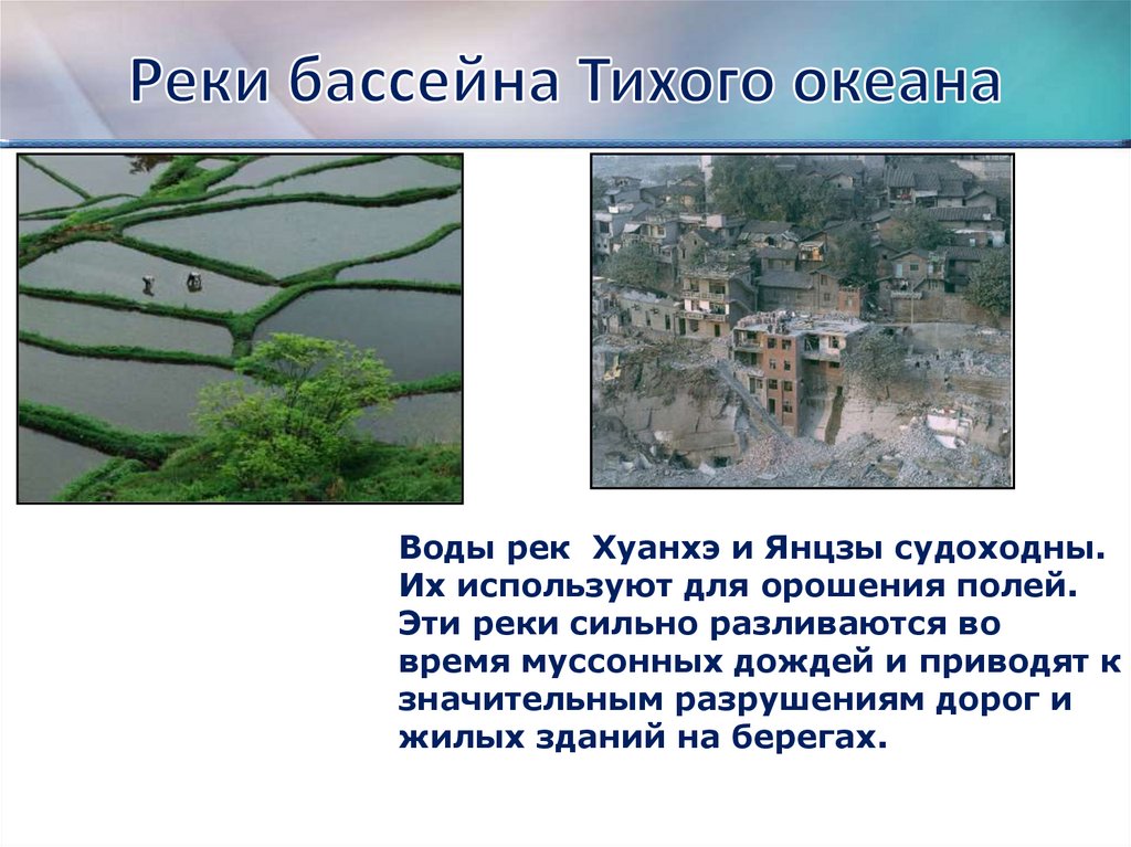 Воды рек Хуанхэ и Янцзы судоходны.Их используют для орошения полей.