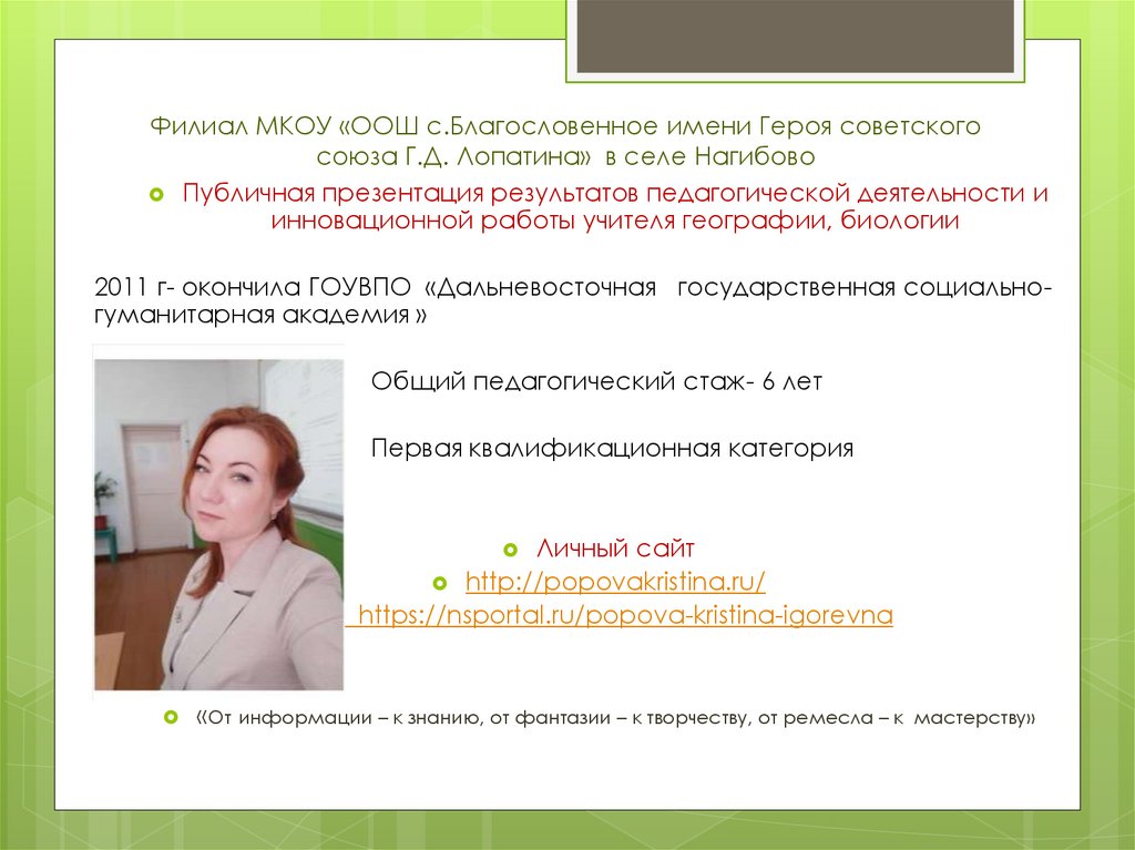 Публичная презентация результатов педагогической деятельности и инновационной работы учителя географии, биологии