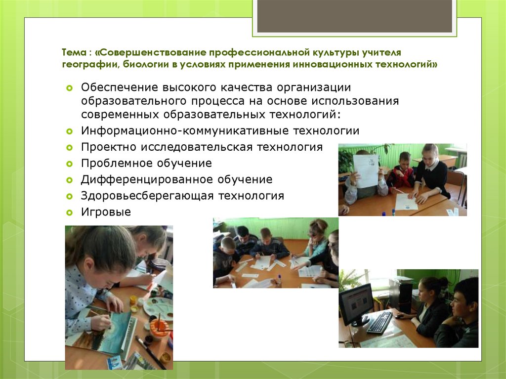 Тема : «Совершенствование профессиональной культуры учителягеографии, биологии в условиях применения инновационных технологий»