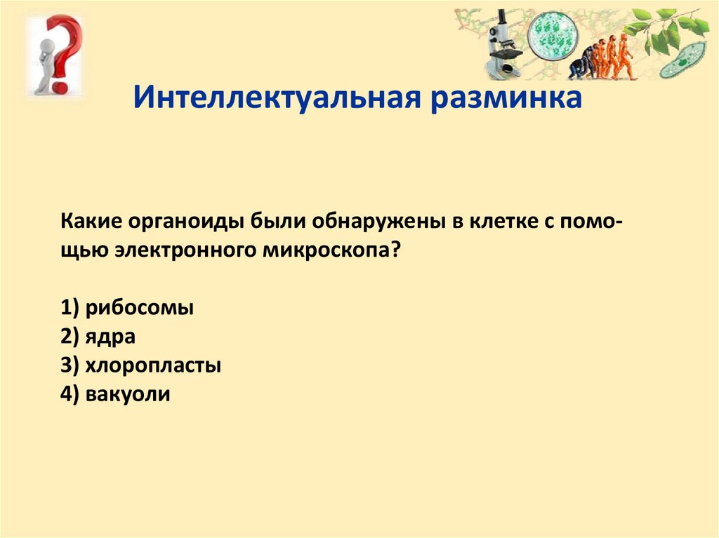 Интеллектуальная разминкаКакие органоиды были обнаружены в клетке с помощью электронного микроскопа?