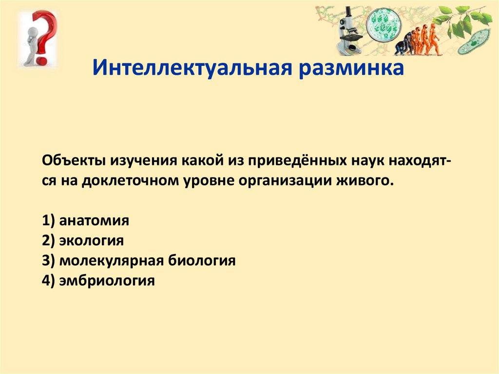 Интеллектуальная разминкаОбъекты изучения какой из приведённых наук находятся на доклеточном уровне организации живого.