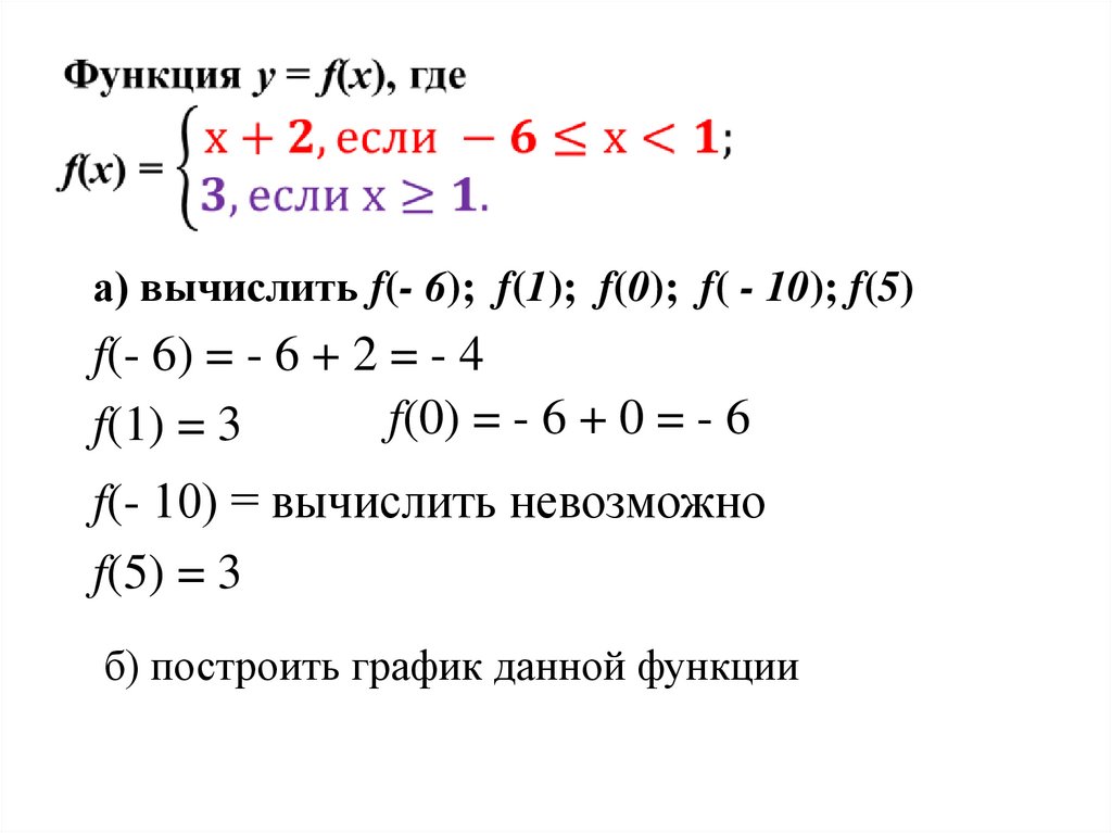 а) вычислить f(- 6); f(1); f(0); f( - 10); f(5)f(- 6) = - 6 + 2 = - 4