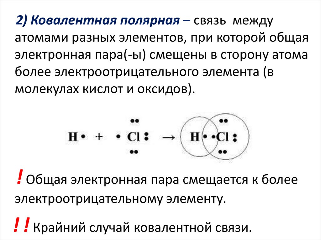 2) Ковалентная полярная – связь междуатомами разных элементов, при которой общая