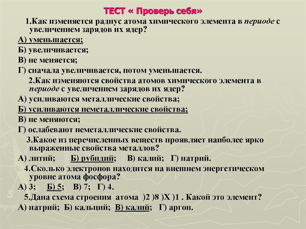 ТЕСТ « Проверь себя»1.Как изменяется радиус атома химического элемента в периоде с