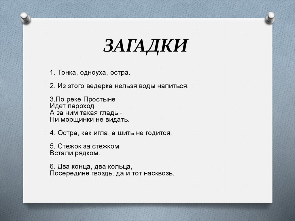 ЗАГАДКИ1. Тонка, одноуха, остра.