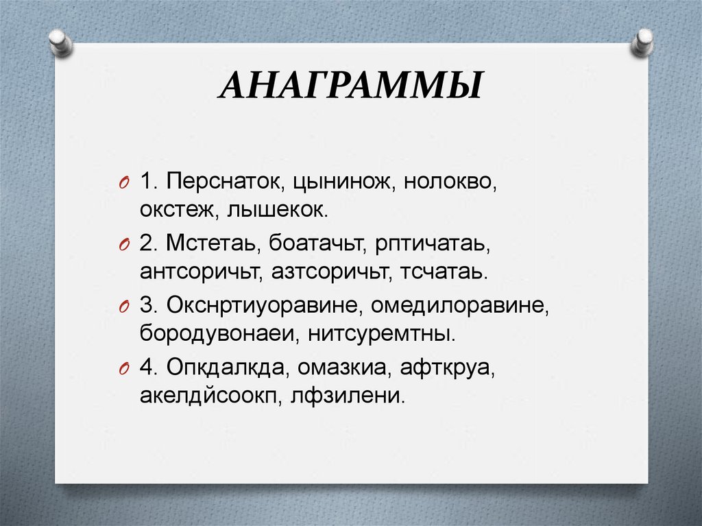 АНАГРАММЫO 1. Перснаток, цынинож, нолокво,