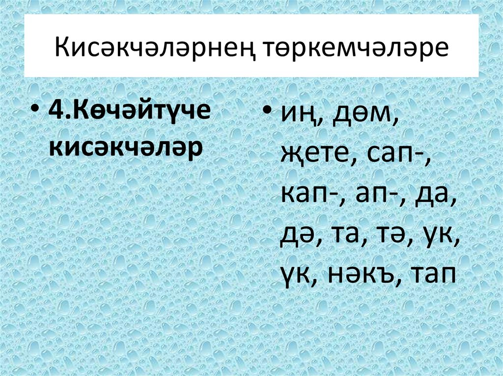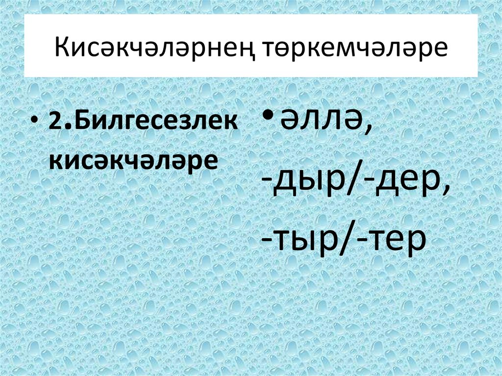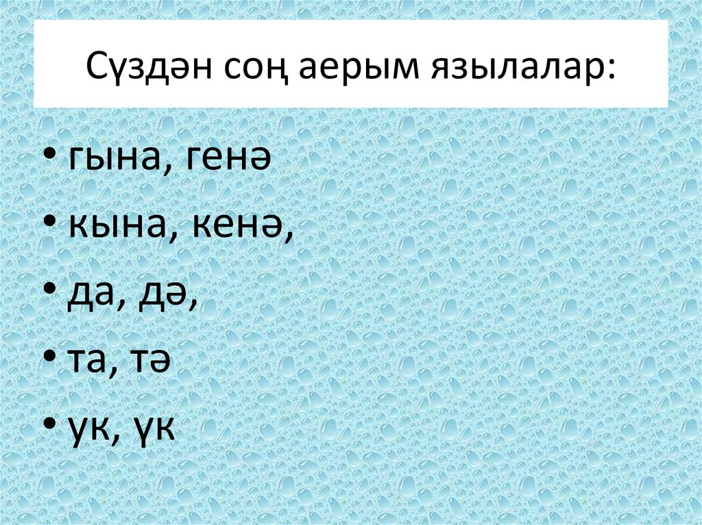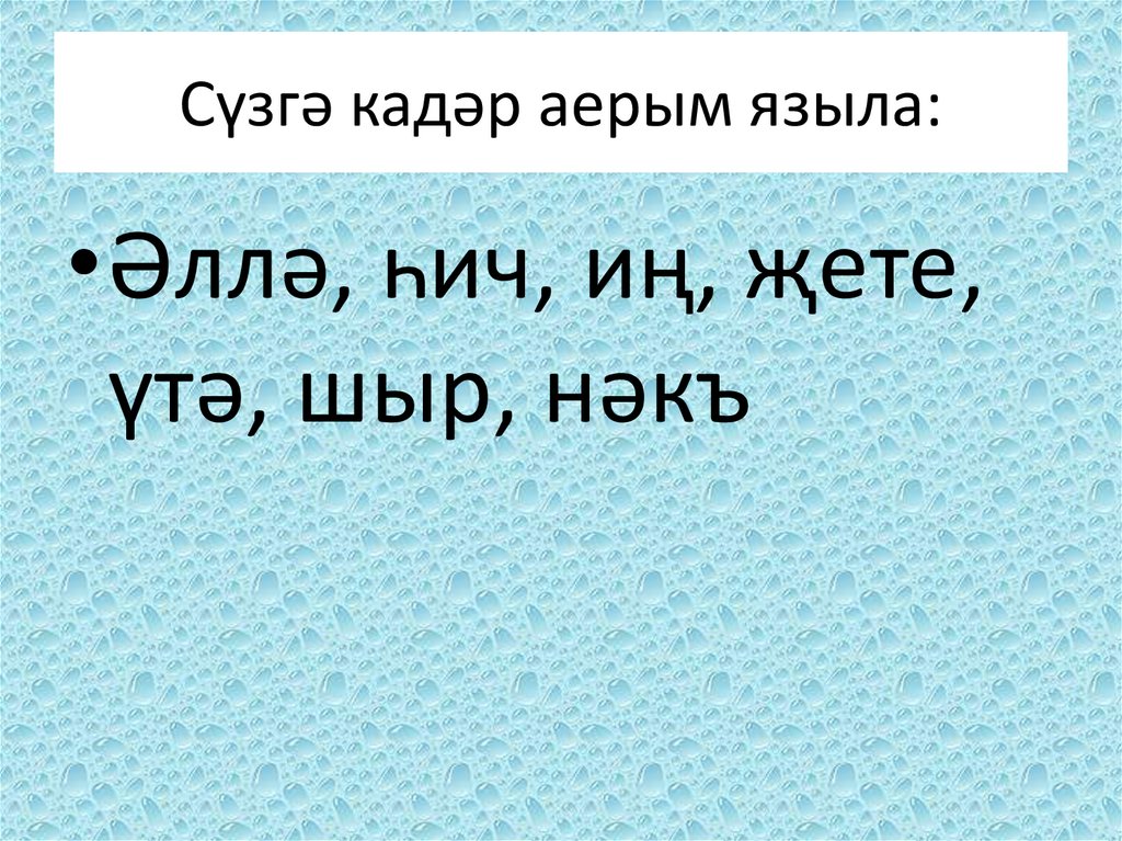 Сүзгә кадәр аерым языла:•Әллә, һич, иң, җете,