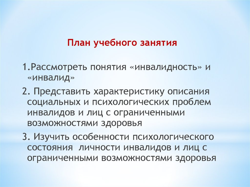 План учебного занятия1.Рассмотреть понятия «инвалидность» и