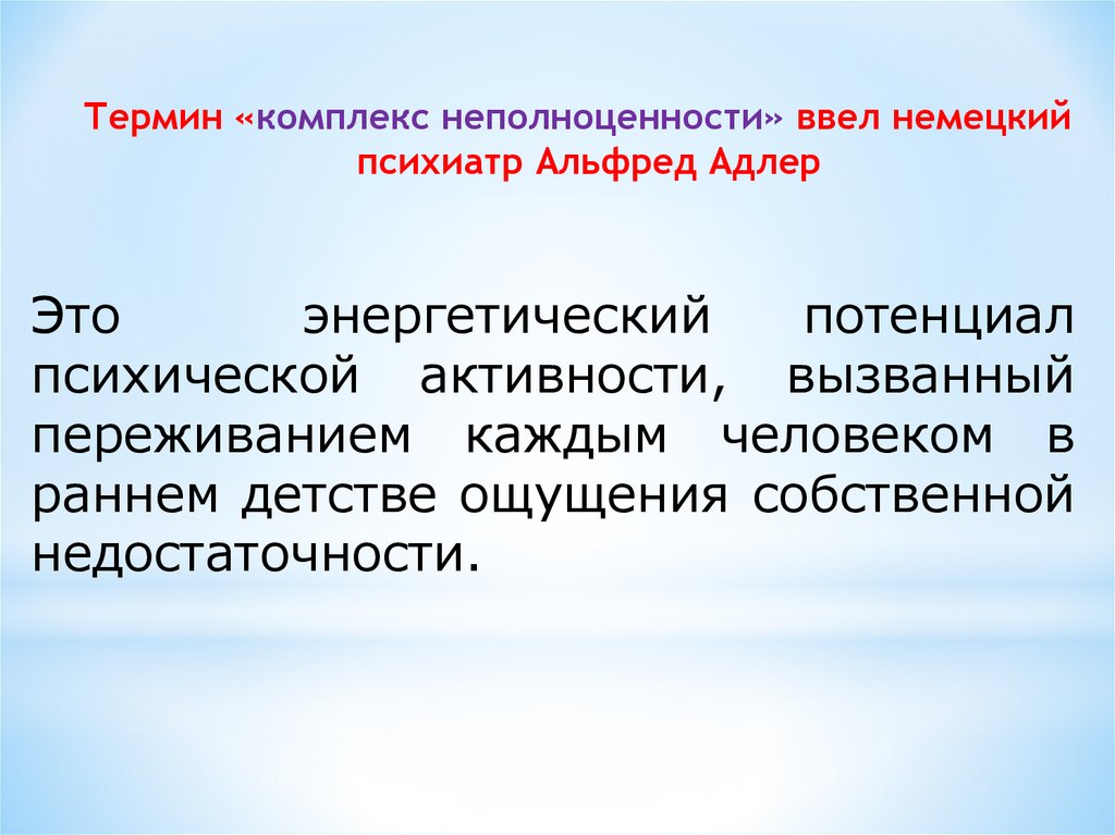 Термин «комплекс неполноценности» ввел немецкийпсихиатр Альфред Адлер