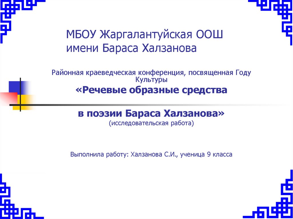 Выполнила работу: Халзанова С.И., ученица 9 класса