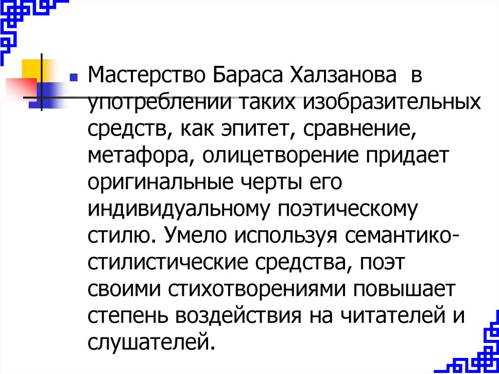 Мастерство Бараса Халзанова вупотреблении таких изобразительных