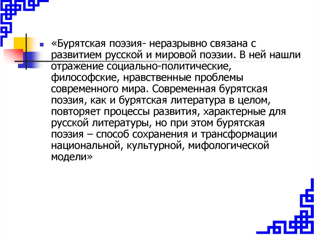 «Бурятская поэзия- неразрывно связана сразвитием русской и мировой поэзии. В ней нашли