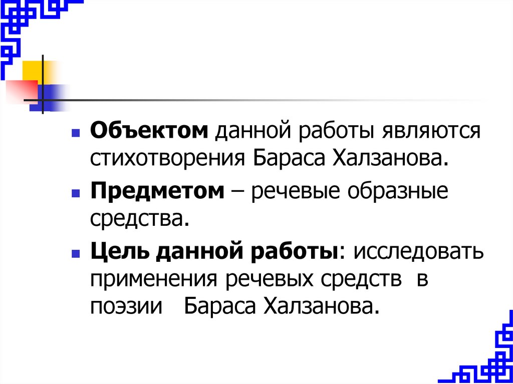 Объектом данной работы являютсястихотворения Бараса Халзанова.