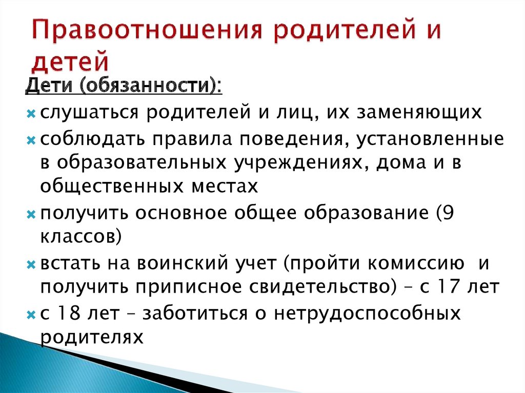 Дети (обязанности):слушаться родителей и лиц, их заменяющих