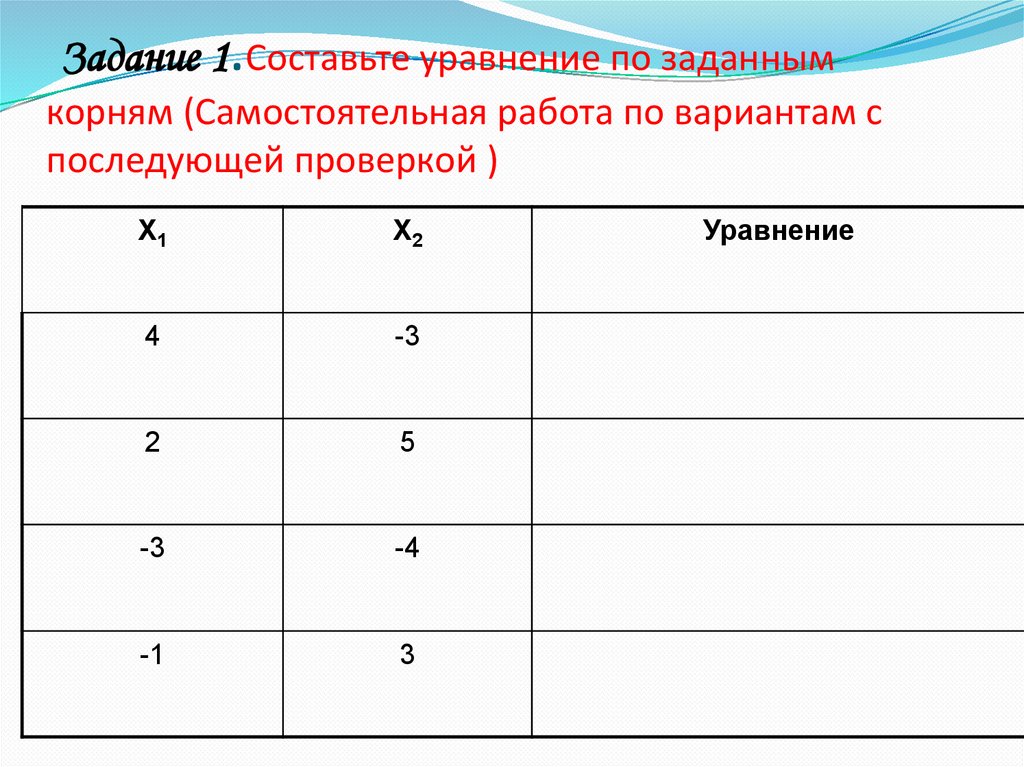 Задание 1.Составьте уравнение по заданнымкорням (Самостоятельная работа по вариантам с