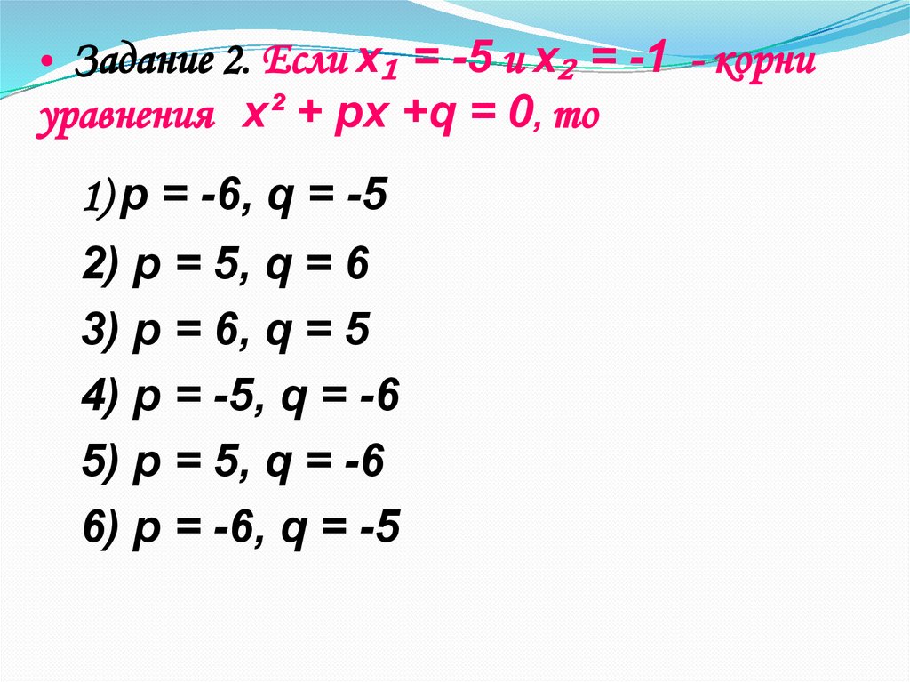 • Задание 2. Если х₁ = -5 и х₂ = -1 - корниуравнения х² + px +q = 0, то