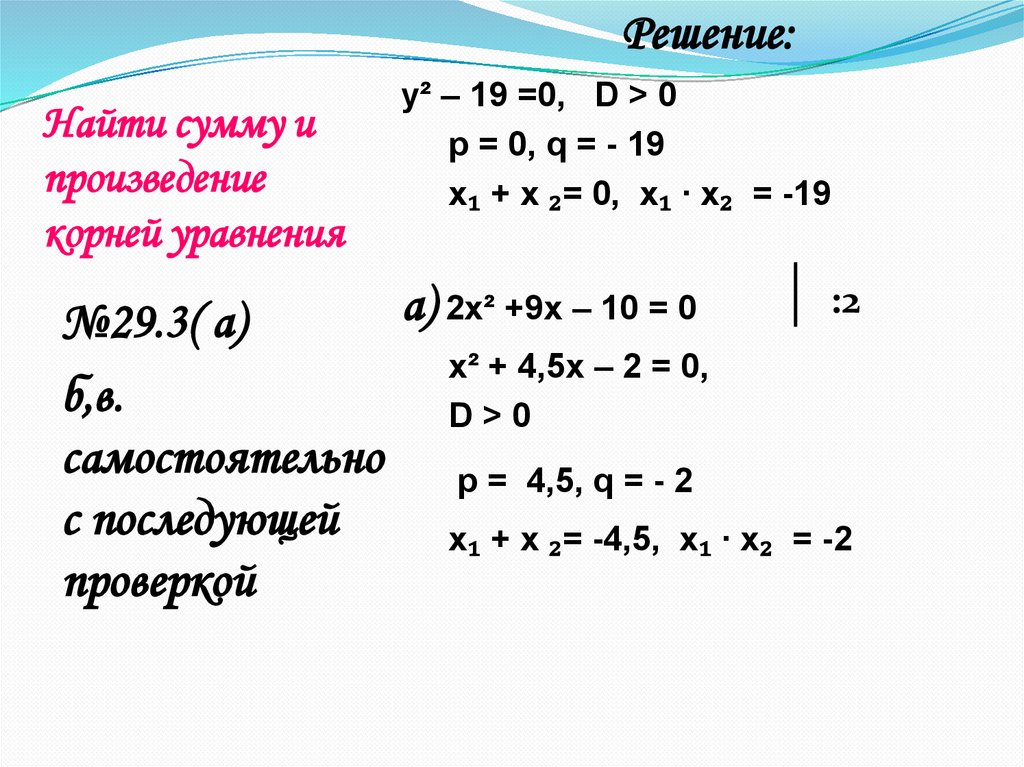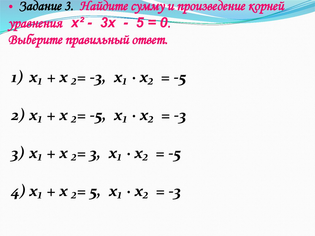• Задание 3. Найдите сумму и произведение корнейуравнения х² - 3х - 5 = 0.