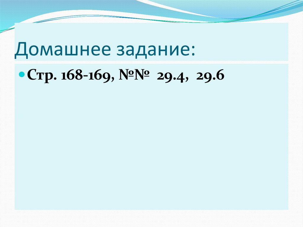 Домашнее задание:Стр. 168-169, №№ 29.4, 29.6