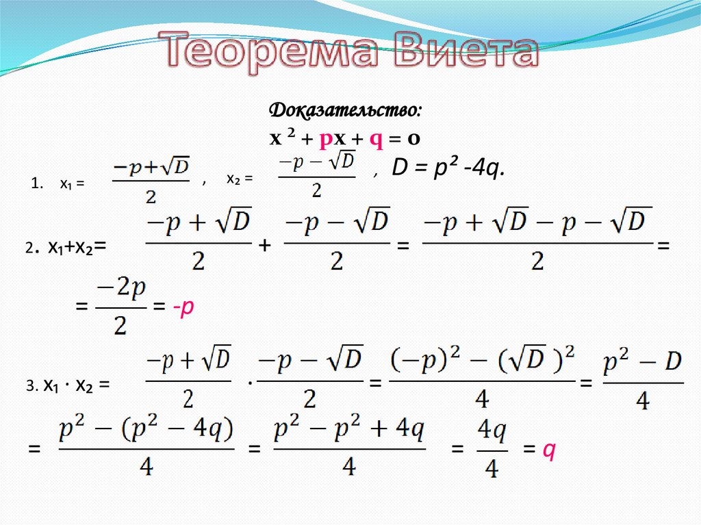 x₁ +х₂ = - p, x₁ ∙ x₂ = q