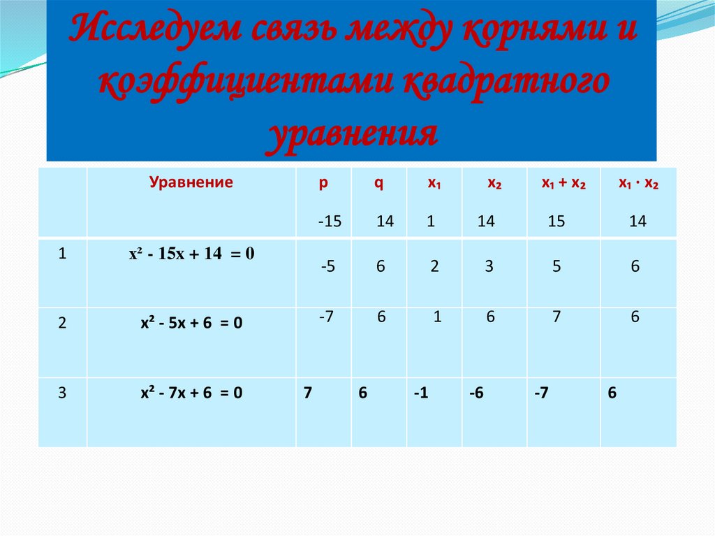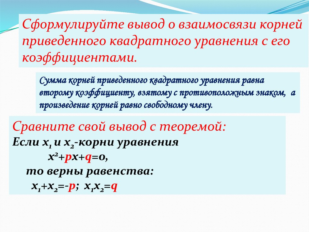 Сформулируйте вывод о взаимосвязи корнейприведенного квадратного уравнения с его