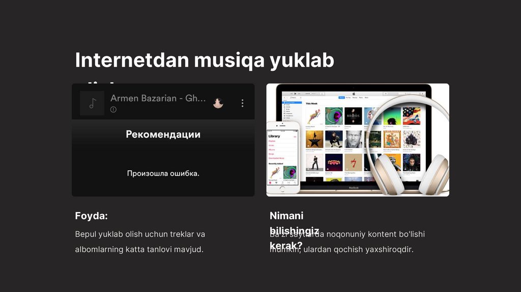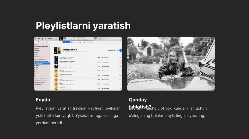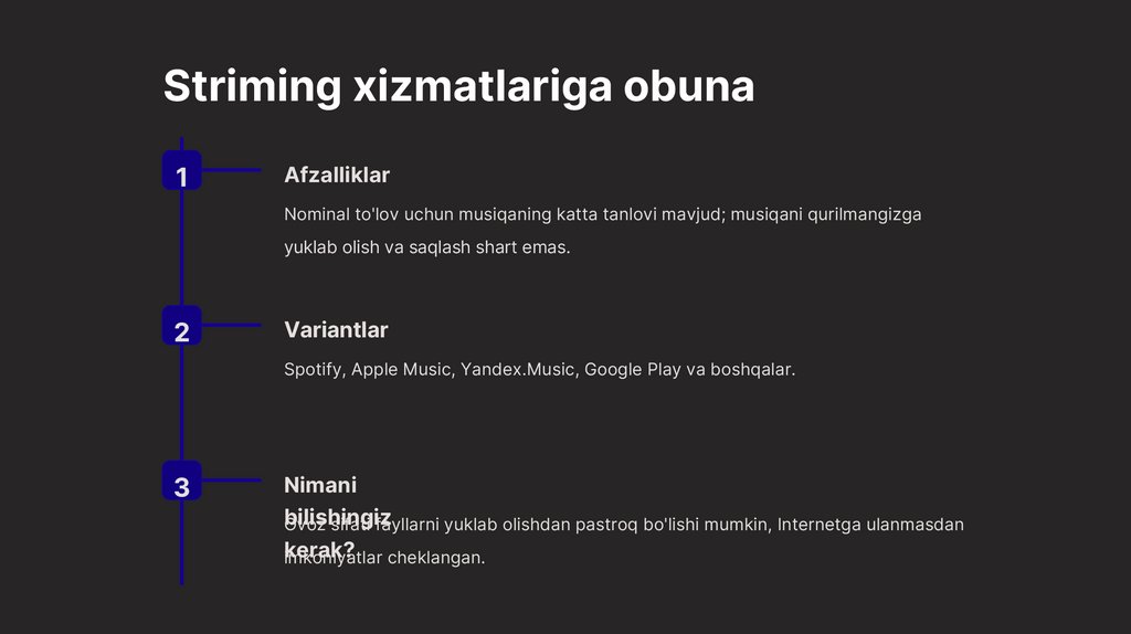Spotify, Apple Music, Yandex.Music, Google Play va boshqalar.