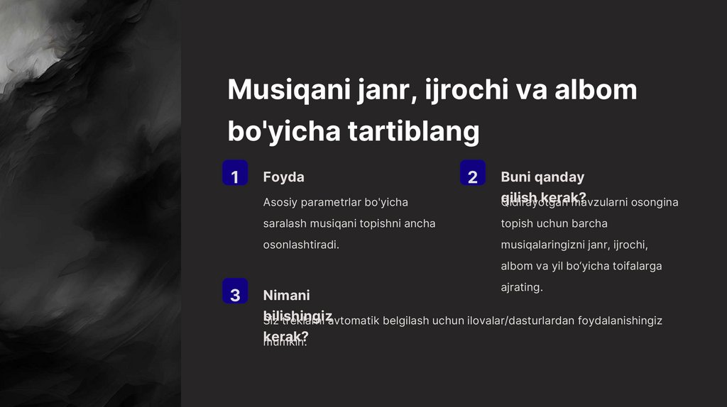 Musiqani janr, ijrochi va albombo'yicha tartiblang